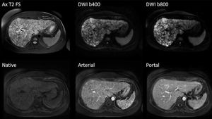 High resolution MR Imaging of the liver in a patient with moderate ability of breath-holding (that's why standard 3D T1 FS was used instead of 3D T1 Dixon). Figure illustrates multiple lesions within the liver, consistent with metastatic disease. Images courtesy of Christos Tsiotsios.