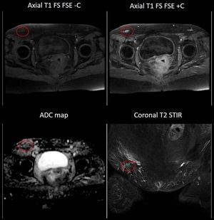 High-resolution, multiparametric (morphological and functional) MR Imaging of the pelvis. Figure illustrates a pelvic lymph node metastasis (red circle), characterized by hypercellularity (low ADC) and Gd uptake.