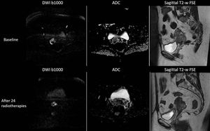 DWI shows that there is an increase in tumour's diffusivity (the ADC value before radiotherapy was 603 μm2/sec, and the ADC value after radiotherapy is 917 μm2/sec) and a decrease in tumour's volume after the radiotherapy. These changes in tumour's microarchitecture are not initially seen using conventional anatomical imaging.