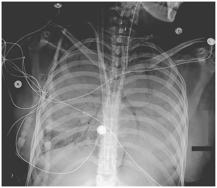 A 26-year-old woman with end-stage renal disease secondary to lupus nephritis presented with a 3-day history of fever, cough, and shortness of breath, symptoms that are consistent with pneumonia. The acute respiratory distress syndrome (ARDS) developed, and the patient ultimately required extracorporeal membrane oxygenation (ECMO) after the failure of mechanical ventilation. A dual lumen ECMO catheter was placed in the right internal jugular vein to drain blood from the superior and inferior vena cavae and return it to the right atrium. Portable anterior–posterior chest radiography showed dense airspace disease with bilateral hemithorax opacification and air bronchograms, a radiologic sign in which the air-filled bronchi are visible as a consequence of the opacification of the surrounding alveoli. Shortly thereafter, cultures from bronchoalveolar lavage revealed Moraxella catarrhalis and Haemophilus influenzae. The patient was treated with appropriate antibiotics, renal-replacement therapy, and supportive care. She was successfully removed from the ECMO circuit after 9 days and weaned from the mechanical ventilator 4 days later. She was discharged to an inpatient rehabilitation facility and continued to do well at the 6-month follow-up.