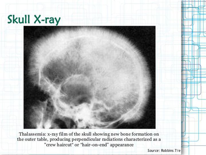 The hair on end sign refers to a radiographic appearance of the diploic space of the skull vault which results from a thickening of trabeculae as the diploic space expands. These trabeculae are perpendicular in orientation, interspersed by radiolucent marrow hyperplasia along the skull vault. It is classically described with plain skull radiographs although can also be appreciated on CT or MRI. Causes include: *thalassemia major *sickle cell disease *hereditary spherocytosis *iron deficiency anemia (any chronic hemolytic disorders) Here's a mnemonic to remember better 😉 "HI NEST" 🙋♀️🙋♂️ H: hereditary spherocytosis I: iron deficiency anemia N: neuroblastoma E: enzyme deficiency, e.g. G-6-PD deficiency S: sickle cell disease T: thalassemia major