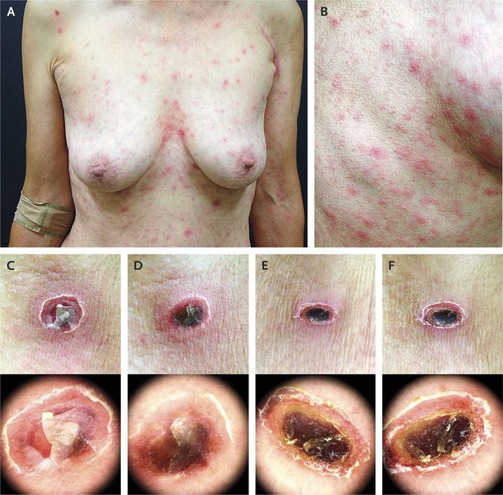 A 65-year-old woman was admitted with fever and rash that had developed 3 days and 1 day before admission, respectively. On physical examination, an erosion 1.5 cm by 1.5 cm with a torn bulla was observed in the right axilla, and a generalized, nonpruritic, maculopapular rash was found over the whole body (Panels A and B). The daily appearance of eschar was evaluated by dermoscopy, and routine photography was performed from the first through the fourth hospital day (Panels C through F). Over time, the center of the eschar developed a black crust covering the ulcer, which was surrounded by an erythematous rim. On the fourth day, the rash became faint. Indirect immunofluorescence assay revealed an Orientia tsutsugamushi (formerly known as Rickettsia tsutsugamushi) antibody titer of 1:640. The clinical course was improved after administration of oral doxycycline at a dose of 100 mg twice daily for 7 days. The patient continued to do well, and her condition was stable 2 weeks after discharge. Scrub typhus is a miteborne disease caused by O. tsutsugamushi. Symptoms of acute scrub typhus typically include a fever and maculopapular rash with a primary lesion that evolves over time, as described in this clinical vignette. The disease is transmitted by trombiculid mites, also known as chiggers, and is endemic in parts of Asia. The clinical scenario and typical black eschar are often key to the diagnosis.