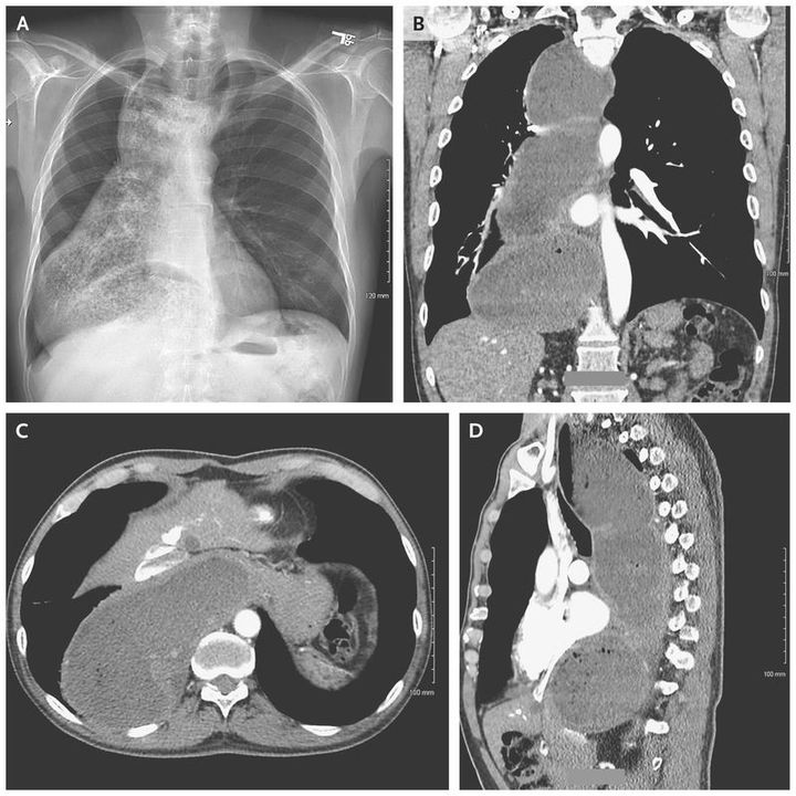 A 63-year-old man with a history of hypothyroidism presented with a 10-year history of dysphagia to solid foods and liquids. He had had worsening of his symptoms for 6 months before presentation, with an associated weight loss of 27 kg (60 lb). An anterior–posterior radiograph of the chest obtained on admission while the patient was in the upright position showed a mediastinal structure with internal debris (Panel A). Computed tomographic imaging revealed food extending from the proximal esophagus to the esophagogastric junction (Panel B shows the coronal scan, Panel C the cross-section view, and Panel D the sagittal view). Esophagogastroduodenoscopy revealed a dilated esophagus with food, and no strictures or masses were identified. The patient received a diagnosis of achalasia causing megaesophagus. Achalasia is caused by impaired relaxation of the lower esophageal sphincter and typically manifests as dysphagia to both solid foods and liquids. The patient underwent esophagectomy with a gastric pull-through procedure, and a jejunal feeding tube was placed. Eight months later, he had good oral intake and the tube was removed.