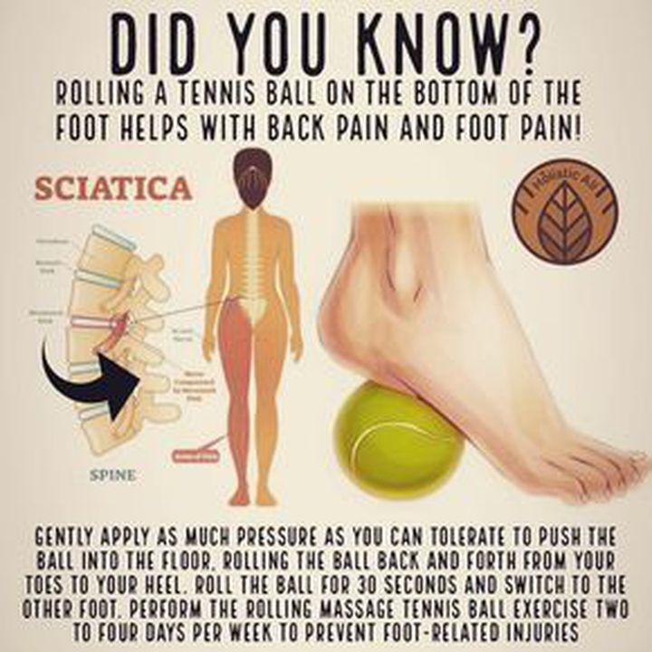 Do you know this_ The tennis ball presses and treats trigger points in the piriformis muscle, reduces the muscle tension and rigidity, improves mobility and improves blood circulation to the area_The tennis ball therapy is good not only for sciatica, but also for back pain. The tennis ball acts as a massage substitute that helps reduce muscle tension and provide relief from lower back pain in the left side or the right side. It is also one of the best ways to relieve pain! Let's brush through the topic - - Sciatica is a medical condition characterized by pain going down the leg from the lower back.This pain may go down the back, outside, or front of the leg.Onset is often sudden following activities like heavy lifting, though gradual onset may also occur.The pain is often described as shooting.Typically, symptoms are only on one side of the body and sometimes may result in pain on both sides. Lower back pain is present at times along with weakness or numbness. Causes-- About 90% of sciatica is due to a "spinal disc herniation" pressing on one of the lumbar (L4, L5) or sacral nerve roots(S1 and less commonly S2, S3). Spondylolisthesis, spinal stenosis, piriformis syndrome, pelvic tumors, and pregnancy are other possible causes of sciatica. The piriformis syndrome - It's a rare condition where the sciatic nerve runs through the piriformis muscle rather than beneath it.When the piriformis shortens or spasms due to trauma or overuse, it is posited that this causes compression of the sciatic nerve. Piriformis syndrome has colloquially been referred to as "WALLET SCIATICA" since a wallet carried in a rear hip pocket compresses the buttock muscles and sciatic nerve when the bearer sits down. Piriformis syndrome may be suspected as a cause of sciatica when the spinal nerve roots contributing to the sciatic nerve are normal and no herniation of a spinal disc is apparent. DIAGNOSIS - - The most applied diagnostic test is the "straight leg raise" to produce Lasègue's sign, which is considered positive if pain in the distribution of the sciatic nerve is felt with passive flexion of the straight leg between 30 and 70 degrees. Imaging modalities such as CT or MRI can help with the diagnosis of lumbar disc herniation. TREATMENT - - When the cause of sciatica is lumbar disc herniation (90% of cases), most cases resolve spontaneously over weeks to months. More than 75% of sciatica cases are managed without surgery.In persons that smoke who also have sciatica, smoking cessation should be strongly considered. PHYSICAL ACTIVITY is often recommended for the conservative management of sciatica for persons that are physically able. Medication-- NSAIDs are commonly recommended as a first-line treatment for sciatica. In those with sciatica due to piriformis syndrome, botulinum toxin injections may improve pain and function. Surgery If sciatica is caused by a herniated disc, discectomy, has tentative evidence of benefit in the short term. If the cause is spondylolisthesis or spinal stenosis, surgery appears to provide pain relief for up to two years.