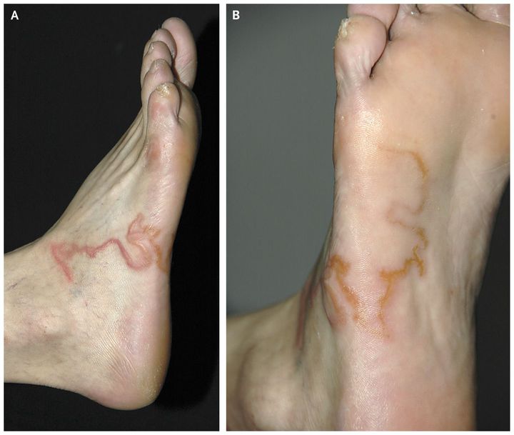 A 42-year-old man presented with a 1-month history of an intensely pruritic eruption on his right foot after a vacation in Nigeria. The eruption was migratory, moving a few millimeters to a few centimeters daily. Physical examination revealed a serpiginous, erythematous raised tract on his right foot (Panels A and B), a finding typical of creeping eruption, or cutaneous larva migrans. The patient was treated with albendazole. After 2 weeks, the lesion healed completely. No recurrence was seen at a 2-month follow-up visit. Cutaneous larva migrans is most commonly caused by migration, in the skin, of hookworm larvae that are transmitted through contact with feces from infected dogs or cats. The parasite is confined to the epidermis because it lacks the collagenase necessary to break through the basement membrane. Clinically, it is characterized by an intensely itchy, erythematous, linear or serpiginous eruption that is seen most commonly on the feet, back, buttocks, thighs, or abdomen. Although it is a self-limited disease, anthelmintic treatment can diminish the symptoms and shorten the duration of disease. Dong-Lai Ma, M.D., Ph.D. Peking Union Medical College Hospital, Beijing, China Source: nejd.org