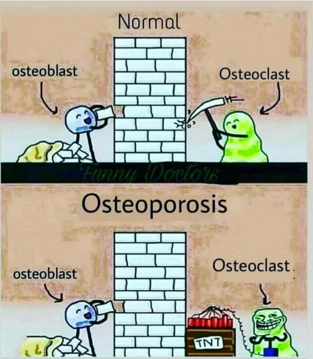 This funny illustration is just to show the root cause of osteoporosis. In nature, usually everything goes well only when all's working in a balanced way. Likewise our body too follows the same mechanism. If there is some disturbance in the normal balance, then there arises a problem. Usually the "bone making cells" or the osteoblasts and the "bone breaking cells" or the osteoclasts, work in a balanced way. So that as the old cells of the bones are wiped away, the new ones replace them consistently. But when there is any disturbance in this balance, then the whole process is in a chaos. As in, if the osteoblasts function is increasing than the osteoclasts, then there is the condition of osteosclerosis or excessive bone formation in the body. Likewise if the osteoclasts is overworking, then the condition of osteoporosis or the thinning and breaking of bones occur. So what could be the possible triggers?? * Menopause - the greatest risk for osteoporosis because of the estrogen level drop. (Estrogen protects women from bone loss.) *Family history *Females *Lifestyle factors- Smoking, Alcohol *Getting little or no exercise * Being small-framed or thin * Medical conditions- such as hyperthyroidism or hyperparathyroidism *Medicines- These include heparin (a blood thinner), anti-seizure medications phenytoin (Dilantin) and phenobarbital and long term use of corticosteroids (such as Prednisone) Prevention is always better than cure.. So the best way to prevent the disease is to know the risk factors and stop the avoidable factors from our daily lives. 💁♀️ Treatment - ~1st and best tx is - Modify the diet - Food sources of calcium include nonfat milk, low-fat yogurt, plant-based milks or orange juices that are fortified with calcium, broccoli, cauliflower, salmon, tofu and leafy green vegetables. ~In case of deficiencies, vitamin d supplements are recommended. ~Bisphosphonates are the most common medications prescribed such as Alendronate, Risedronate, Ibandronate, Zoledronic acid ~ After menopause - HRT (Hormone replacement therapy) can be used. Either estrogen alone or a combination of estrogen and progestin is known to help preserve bone and prevent fracture.