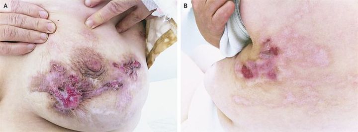 A 50-year-old woman was admitted to the hospital with swelling of the left lateral malleolus after an ankle sprain and rupture of the Achilles tendon. The physical examination was notable for ulcerated lesions on the left breast, with sanguineous secretions (Panel A), as well as similar skin lesions on the back and left shoulder (Panel B). These findings prompted both gynecologic and dermatologic consultations. The consultants independently agreed that breast cancer was an unlikely diagnosis. The patient reported that the lesions had been present for many years and had not responded to local treatment. Her social history was notable for a period of homelessness 10 years earlier, during which she had had several sexual contacts. Treponema pallidum hemagglutination testing showed a titer of 1:20,480, and a T. pallidum particle agglutination assay performed on a cerebrospinal fluid sample was positive. Tertiary syphilis was diagnosed, and the patient was treated with high-dose penicillin. The ulcerating skin lesions resolved quickly after antibiotic treatment. The ruptured Achilles tendon was treated with surgical reconstruction.