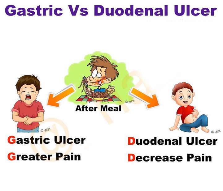 Better to understand why than to memorize this mnemonic! Eating causes the pyloric sphincter to close, which prevents aggravating chemicals etc. from entering the duodenum, hence why pain of duodenal ulcers is relieved temporarily by eating! Pain onset will be delayed