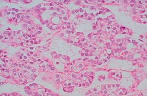 An 18-year-old sexually active woman has had dyspareunia followed by vaginal bleeding for the past month. On pelvic examination, a red, friable, 2.5-cm nodular mass is seen on the anterior wall of the upper third of the vagina. The microscopic appearance of a biopsy specimen is shown in the figure. Which of the following conditions is likely to have contributed most to the origin of this neoplasm? A. Congenital adrenal hyperplasia B. Diethylstilbestrol (DES) exposure C. Human papillomavirus infection D. Polycystic ovary syndrome (PCOS) E. Trichomonas vaginitis The microscopic appearance is that of a malignant tumor containing cells with a clear cytoplasm. Vaginal clear cell carcinomas are associated with exposure of the patient’s mother to diethylstilbestrol (DES) during pregnancy. Vaginal adenosis: Bengin remnants of müllerian glands. Precursor lesion for clear cell carcinoma. It is a benign abnormality in the vagina, commonly thought to be caused by intrauterine and neonatal exposure of diethylstilbestrol and other progestagens and nonsteroidal estrogens, however it has also been observed in otherwise healthy women and has been considered at times idiopathic or congenital.