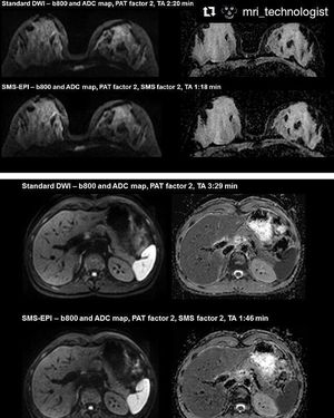 #Repost @mri_technologist (@get_repost) ・・・ Diffusion-weighted imaging (DWI) has great potential in body oncology, however, being a single-shot technology, the acquisition is relatively time consuming. Simultaneous Multi-Slice (SMS)-EPI deploys multiband pulses to excite multiple slices simultaneously. This excitation is combined with a blipped CAIPIRINHA approach during readout to reduce g-factor related SNR loss. As a result, an additional acquisition time reduction of up to 46% without compromising image quality compared to a standard GRAPPA 2 can be achieved with SMS 2 in combination with GRAPPA 2 in breast and abdominal scans. Prerequisite: Software version syngo MR E11C and SMS-EPI license. #MRI #SMS #DWI #SS_EPI #MRI_Technologist #MRITechnologist #MRI_Radiographer #Siemens_MRI
