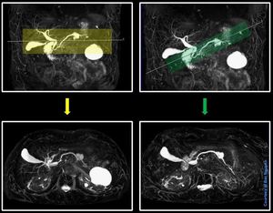 MRCP – Pancreas @ Siemens 1.5T Aera Different angulations, different results and saving of scan time Look how well pancreas is depicted on the direct transversal on pancreas (green box), and how less slices you need to cover the whole pancreas. Results of this means greater images and time savings compared to direct transversal on abdomen in general (yellow box).#s_mri #siemens #mri #pancreas #mrcp