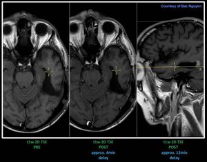 MRI Neuro Imaging – Post GD Take a closer look at the lesion post contrast transversal, approx. 4min delay compared to the post contrast sagittal. Stronger enhancement at the sagittal due to longer waiting time. Just wanted to highlight that waiting time do count, but how long should we wait is another question. #s_mri #siemens #mri #neuro #gadolinium