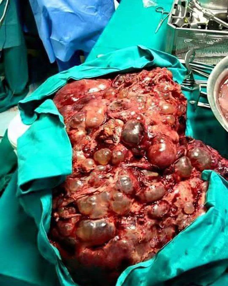 Polycystic liver disease (PLD or PCLD) is a rare condition that causes cysts -- fluid-filled sacs -- to grow throughout the liver. A normal liver has a smooth, uniform appearance. A polycystic livercan look like a cluster of very large grapes. Cysts also can grow independently in different parts of the liver. The cysts, if they get too numerous or large, may cause discomfort and health complications. But most people with polycystic liver disease do not have symptoms and live a normal life.