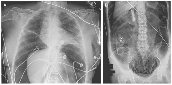 A 65-year-old woman who had undergone colonoscopy with removal of multiple polyps had become unresponsive at the end of the procedure and was transferred to the emergency department for evaluation. She regained consciousness but remained in distress with diaphoresis. On physical examination, the heart rate was 130 beats per minute, and the skin of the abdominal and pelvic areas and lower limbs was mottled. The abdomen was massively distended, tympanitic, and diffusely tender to palpation with evidence of guarding. Chest and abdominal radiographs (Panels A and B) revealed a large amount of free air under the diaphragm with centralization of the intraabdominal contents that was consistent with a massive tension pneumoperitoneum. The patient was taken to the operating room, where she underwent a decompressive laparotomy (Video) and a wedge partial colectomy to correct an iatrogenic perforation of the ascending colon. The patient had an uneventful recovery and was discharged home on the third postoperative day.