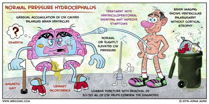 Normal-pressure hydrocephalus (NPH), also called communicating hydrocephalus/ malresorptive hydrocephalus, is a condition in which (CSF) occurs in the ventricles with normal or slightly elevated csf pressure. Classic triad of symptoms include urinary incontinence dementia Abnormal gait Diagnosis - Patients with suspected NPH should have typical symptoms in addition to ventricular enlargement on neuroimaging(CT and MRI). Treatment strategy - The treatment of choice is a surgical placement of "ventriculoperitoneal shunt" to drain excess CSF. No medications are effective for primary NPH. Acetazolamide and other diuretics are not recommended except for limited use in patients who are not willing to have the surgery done.