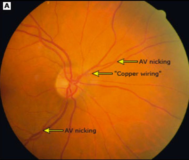 Normally arterioles present in eye are transparent but due to hypertension they become thickened. This phenomenon is called copper wire or silver wire phenomenon.