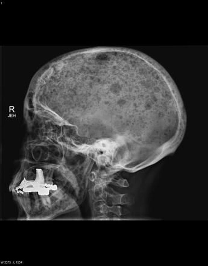 The raindrop skull is a typical striking feature of multiple myeloma. Innumerable well circumscribed 'punched out' lytic lesions can be best seen in the lateral view of the skull. An easily learnt mneumonic for the symptoms of multiple myeloma is "CRAB" 🦀 🦀 🦀 C- calcium elevated R- renal failure A- anemia B- bone lesions (lytic) and bone pain 🦀 🦀 🦀