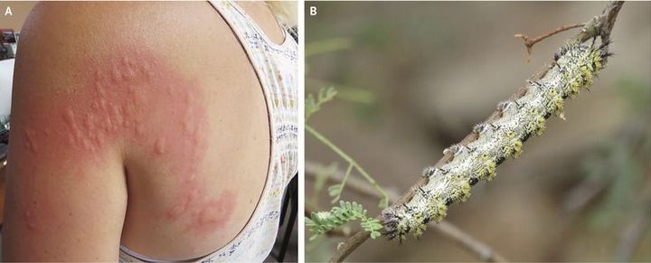 A 42-year-old woman contacted the Arizona Poison and Drug Information Center (AZPDIC) after envenomation by a tricolor buckmoth caterpillar (Hemileuca tricolor). She was underneath a mesquite tree in her yard when the caterpillar fell onto her posterior left shoulder. Within minutes, a pruritic urticarial eruption had developed. Within 1 hour after the envenomation, the patient took the accompanying photographs of the rash (Panel A) and of an identical caterpillar (Panel B) in her yard and sent them to the AZPDIC for recommendations. She was instructed to use cold compresses and topical antihistamine cream to alleviate her symptoms. The rash resolved within a few days. Erucism (also called caterpillar dermatitis) is caused by envenomation by the larval or pupal stages of moths or butterflies (order Lepidoptera). There are multiple venomous species in the United States and throughout the world, with the greatest concentration in the temperate and tropical climate zones. Rash is the most common clinical manifestation and responds well to antihistamines and topical glucocorticoids. However, allergic conjunctivitis or bronchospasm may occur if airborne hairs that are released from the caterpillar land in the person’s eyes or are inhaled. Anaphylactoid reactions have also been described.