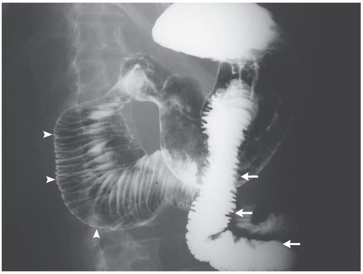 A 46-year-old woman who had a 7-year history of systemic sclerosis and used methotrexate for its treatment presented to the emergency department with abdominal pain, persistent nausea, and vomiting of undigested food that had begun 3 months earlier. On physical examination, she was noted to have skin with woody induration and loss of normal elasticity, dry eyes, and a decreased oral aperture. The physical examination of the abdomen was normal. Upper gastrointestinal endoscopy showed no evidence of mechanical obstruction or esophageal damage; a barium-swallow examination revealed duodenal distention of up to 8 cm in diameter (arrowheads), without evidence of mechanical obstruction, and normal intestinal caliber of the jejunum (arrows). Megaduodenum secondary to systemic sclerosis was diagnosed after assessments for other conditions, including amyloidosis, Chagas’ disease, and Whipple’s disease, were unrevealing. Assessments included biopsy of the distal duodenum and testing for antibodies to Trypanosoma cruzi and Tropheryma whipplei. Placement of a jejunostomy tube for feeding resulted in a reduction in the patient’s symptoms and a weight gain of nearly 4 kg over a period of 8 months. Gastrointestinal manifestations of systemic sclerosis may include esophageal and gastric dysmotility; duodenal involvement is rare.