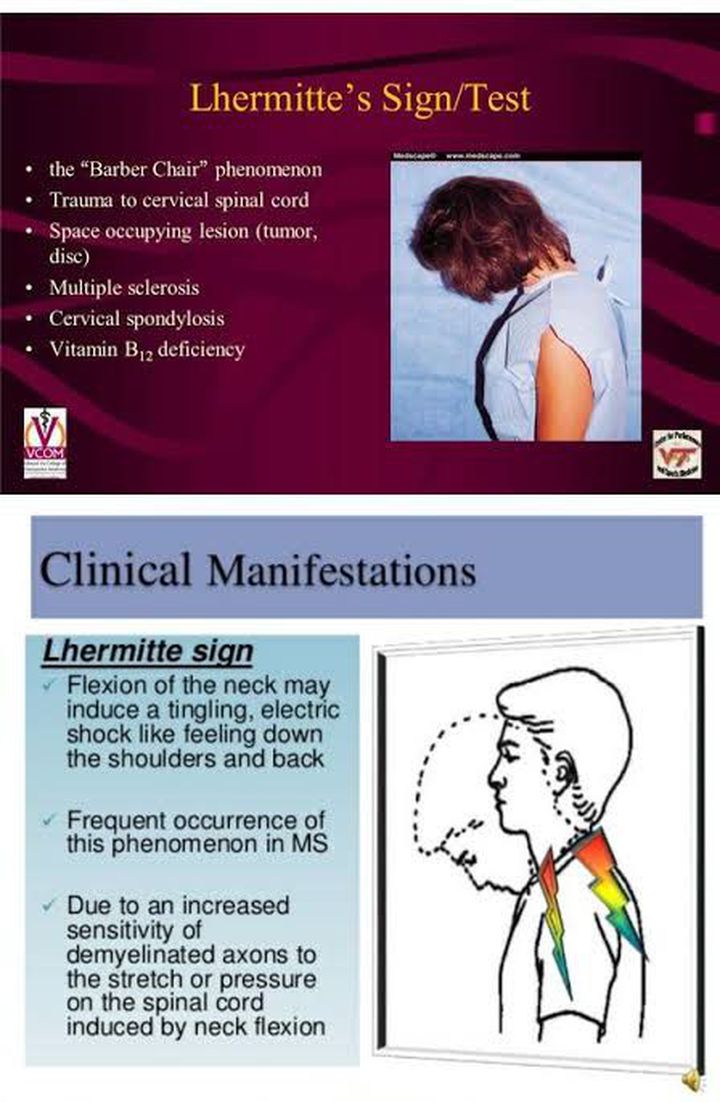 The first slide talks about the cases where of Lhermitte sign can be seen and the second one about the clinical findings. Overall, the sign is positive when there is a demylination of nerves in the cervical region that leads to the shock like feel down the spine when one bends his/her neck. It's interestingly also called the "barber chair phenomenon" as the position in which the sign appears to be positive is just similar to how when a person has a haircut.. Nothing to do with a barber's chair in real 😉💁♀️