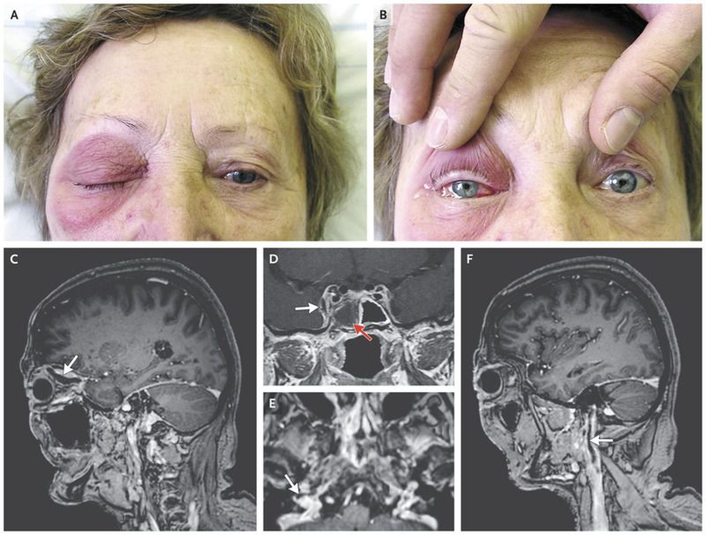 A 71-year-old woman presented with 5 days of right retroauricular pain that radiated to the retrobulbar area, with accompanying putrid nasal discharge, body chills, double vision, and swelling of the right eye. Physical examination revealed right ptosis, chemosis, a visual acuity of 20/32, limited eye movements in all directions, and hypoesthesia in the ophthalmic branch of the trigeminal nerve (Panels A and B). Contrast-enhanced magnetic resonance imaging showed a partially occlusive thrombus in the right superior ophthalmic vein (Panel C), cavernous sinus (Panel D), inferior petrosal sinus (Panel E), and internal jugular vein (Panel F) (white arrows). Moreover, there was pus in the right sphenoid sinus (red arrow in Panel D). The blood cultures and sinus aspiration material grew Enterobacter cloacae complex. The patient had no obvious predisposing factors for acute sinusitis and was not immunocompromised. She was treated with surgical débridement, antibiotics, and anticoagulation and recovered completely. Sinus infection can spread through direct extension or travel from mucosal veins through a valveless system of diploic, cerebral, and emissary veins to venous sinuses, the latter being the most plausible cause in the present case.