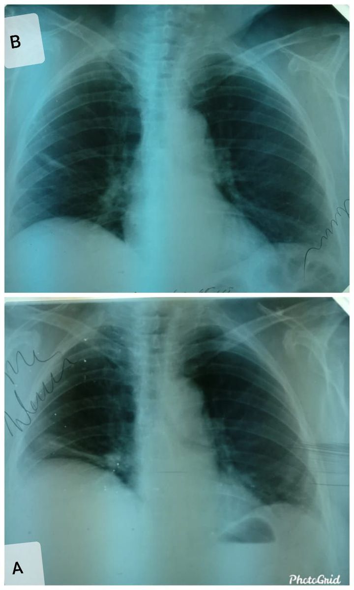 A 65 years old female was hospitalized with the symptoms of lobar pneumonia, the X ray was seen with a very interesting picture with an uplift of diaphragm (panel A). The patient was treated with antibiotics the treatment was also followed with detoxification and oxygen therapy and after 2 weeks fluroscopy was done again and the another picture (panel B), the infiltration reduced, the diaphragm was also in position and the lung picture came to normal
