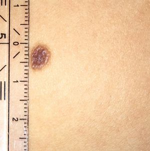 15 yrs old male, with multiple liver spots, ABCDE: A: Positive B: Positive C: Positive D: 7-8 mm E: Positive Your Diagnose?