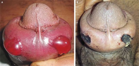 A 46-year-old farmer presented to the emergency department 3 hours after his penis was bitten by a snake while he was urinating in an open field. The snake was identified by the patient as “gunas,” which is the local name of the Levantine viper (Macrovipera lebetina). Physical examination revealed stable vital signs, with a grossly swollen penis and formation of hemorrhagic bullae at the puncture sites (Panel A). Laboratory investigations showed an initial prothrombin time of 17 seconds (reference value, <12), an activated partial-thromboplastin time of 34 seconds (reference value, <24), and a fibrinogen level of 80 mg per deciliter (reference range, 200 to 400). Venous and arterial Doppler ultrasonography revealed normal flow in the cavernosal and dorsal vessels of the penis. The patient received polyvalent anti–snake venom (a snake antivenom serum that neutralizes the venom of the cobra, common krait, and viper) with no adverse effects. At 36 hours after the initiation of treatment, the patient’s coagulopathy had resolved and he was discharged home. The swelling subsided 4 days after discharge, with the formation of necrotic tissue at the puncture sites (Panel B). The patient had recovered completely at 2-week follow-up.