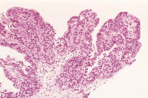 A 65-year-old man recently retired after many years in a job that involved exposure to aniline dyes, including β-naphthylamine. One month ago, he had an episode of hematuria that was not accompanied by abdominal pain. On physical examination, there are no abnormal findings. Urinalysis shows 4+ hematuria, and no ketones, glucose, or protein. Microscopic examination of the urine shows RBCs that are too numerous to count, 5 to 10 WBCs per high-power field, and no crystals or casts. The result of a urine culture is negative. Cystoscopy is performed, and biopsy of a lesion reveals the microscopic appearance in the figure. Which of the following neoplasms is he most likely to have? A. Adenocarcinoma B. Rhabdomyosarcoma C. Renal cell carcinoma D. Squamous cell carcinoma E. Urothelial carcinoma . #usmle #usmlestep1 #bladdercancer . . Exposure to arylamines markedly increases the risk of urothelial carcinoma shown the in figure, which can occur decades after the initial exposure. After absorption, aromatic amines are hydroxylated into an active form, which is detoxified by conjugation with glucuronic acid and then excreted. Urinary glucuronidase splits the nontoxic conjugated form into the active carcinogenic form. Adenocarcinoma is a complication of the congenital condition known as exstrophy of the bladder. Rhabdomyosarcoma of the pelvis is typically a pediatric neoplasm, and not associated with chemical exposures. Renal cell carcinomas also may manifest as painless hematuria, but exposure to aniline dyes is not a risk factor. Squamous cell carcinoma is the most common malignancy of the urethra, but it is rare and has no relation to carcinogens. Urinary bladder tumor Low-grade cancers: Usually papillary and not usually invasive. Clinical findings: Painless gross/microscopic hematuria. Dysuria, increased frequency of urination.