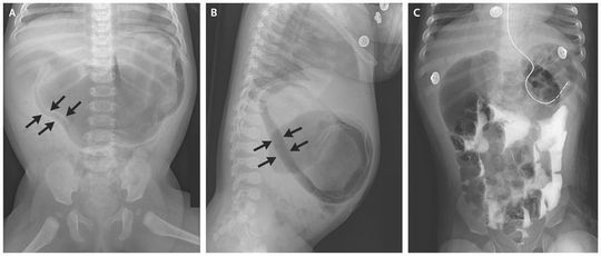 A 4-month-old girl presented with poor feeding and nonbilious emesis. At 1 month of age, she had been hospitalized briefly for emesis but was able to feed until 1 week before presentation. She appeared well, and her abdomen was soft but distended. Laboratory investigations revealed a hypochloremic metabolic alkalosis, and radiographs showed gastric pneumatosis (Panels A and B, arrows). A nasogastric tube was placed, and intravenous administration of fluids was started. Radiography of the upper gastrointestinal tract with contrast revealed contrast medium passing into the small intestine; follow-up images showed resolution of pneumatosis and a “double bubble,” which suggested duodenal obstruction (Panel C). Duodenal obstruction caused by a duodenal web was identified intraoperatively, and a duodenoduodenostomy was performed, which resulted in resolution of symptoms. Gastric pneumatosis is rare and probably results from mucosal disruption due to ischemia or infection that allows gas to infiltrate into the wall of the stomach. In newborns, gastric pneumatosis is associated with necrotizing enterocolitis, but increased intragastric pressure from severe obstruction caused by duodenal blockage, pyloric stenosis, or a lactobezoar may also produce gastric pneumatosis.