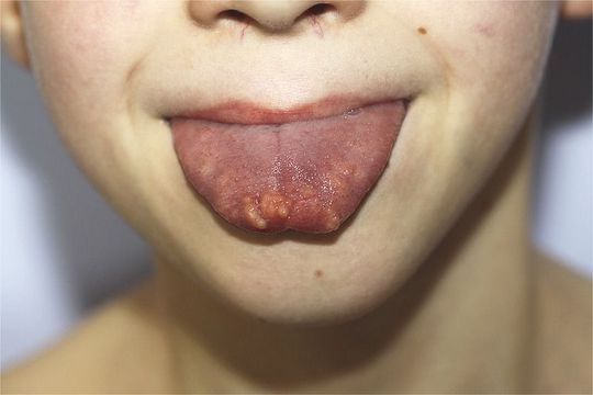 A 9-year-old boy presented with a 6-year history of asymptomatic papules on his tongue, along with chronic constipation and abdominal discomfort since infancy. On physical examination, he was noted to have a marfanoid habitus, coarse facies, tooth malposition, and multiple soft, yellow papules measuring 3 to 12 mm on the tip of his tongue. Findings on histologic analysis of samples obtained from the tongue lesions were consistent with mucosal neuroma and supported the diagnosis of multiple endocrine neoplasia type 2B (MEN2B). Thyroid ultrasonography revealed two hyperechoic nodules. Computed tomography of the abdomen showed large colonic distention. Laboratory evaluation revealed a calcitonin level of 277 pg per milliliter (normal value, <10) and normal urinary and plasma levels of metanephrines. A de novo mutation in the gene encoding ret proto-oncogene (RET) was found. The patient underwent total thyroidectomy and nodal dissection that revealed bilateral medullary thyroid carcinoma with multiple metastatic lymph nodes. Rectal biopsy samples revealed intestinal ganglioneuromatosis. To date, the patient, whose disease is in remission, is under clinical surveillance with testing of serum calcitonin levels. Multiple lingual neuromas are suggestive of MEN2B and should prompt a careful evaluation for medullary thyroid carcinoma.