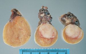 A 29-year-old man complains of a vague feeling of painless heaviness in the scrotum for the past 5 months. He is otherwise healthy. Physical examination shows that the right testis is slightly larger than the left testis. An ultrasound scan shows a solid, circumscribed, 1.5-cm mass in the body of the right testis. The representative gross appearance of the mass is shown in the figure. A biopsy is done, and microscopic examination of the mass shows uniform nests of cells with distinct cell borders, glycogen-rich cytoplasm, and round nuclei with prominent nucleoli. There are aggregates of lymphocytes between these nests of cells. Which of the following features is most characteristic of this lesion? A. Association with 46,X(fra)Y karyotype B. Association with 46,XXY karyotype C. Response to radiation therapy D. Extensive pulmonary metastases E. Elevation of human chorionic gonadotropin level F. Elevation of α-fetoprotein level . Seminoma Age: 30-35 years; >65 Seminoma is a malignant tumor comprised of large cells with clear cytoplasm and central nuclei (resemble spermatogonia) Yellow tumor usually without significant hemorrhage or necrosis. Most common testicular tumor; resembles ovarian dysgerminoma Prognosis: Excellent. Extremely radiosensitive. Elevation of human chorionic gonadotropin level in 10% of cases.