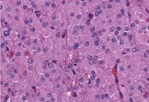 A 37-year-old man has noticed bilateral breast enlargement over the past 6 months. On physical examination, both breasts are enlarged without masses. His right testis is firm and 1.5 times larger than his left testis. His serum estrogen is increased. An ultrasound scan shows a circumscribed 2-cm mass in the body of the right testis. A right orchiectomy is performed, and grossly the mass has a uniform, brown cut surface. The microscopic appearance is shown in the figure. With electron microscopy the cells have rod-shaped crystalloids of Reinke. What is the most likely diagnosis? A. Choriocarcinoma B. Embryonal carcinoma C. Gonadoblastoma D. Leydig cell tumor E. Seminoma F. Teratoma G. Yolk sac tumor . The majority of Leydig cell tumors are found in males, usually at 5–10 years of age or in middle adulthood (30–60 years). Children typically present with precocious puberty. Due to excess testosterone secreted by the tumour, one-third of female patients present with a recent history of progressive masculinization. Masculinization is preceded by anovulation, oligomenorrhea, amenorrhea and defeminization. Additional signs include acne and hirsutism, voice deepening, clitoromegaly, temporal hair recession, and an increase in musculature. Serum testosterone level is high Leydig cell tumors of the testis are most often small, benign masses that may go unnoticed. Some patients have gynecomastia caused by androgenic or estrogenic hormone production (or both) by the tumor. Most patients are young to middle-aged men; sexual precocity may occur in the few boys who have such tumors. Choriocarcinomas are grossly soft and hemorrhagic masses that have large bizarre syncytiotrophoblast and cytotrophoblast cells and are aggressive. Embryonal carcinomas are large, aggressive tumors that have a variegated gross appearance and primitive cells with large, hyperchromatic nuclei. Gonadoblastomas are rare testicular tumors that arise in the setting of gonadal dysgenesis. A pure seminoma can be uniformly brown on cut surface, but often has a lymphoid stroma, and is not likely to secrete androgens or estrogens. Pure teratomas are rare and contain elements of three germ layers. Yolk sac tumors have cells that organize into primitive endodermal sinuses (Schiller-Duval bodies).