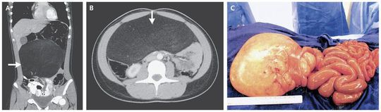 A 13-year-old girl with a history of abdominal discomfort was admitted with an acute onset of bilious vomiting. During the preceding weeks, the patient had reported having constipation, nausea, vomiting, and abdominal and back pain of increasing intensity. The patient’s vital signs were within normal limits. The physical examination revealed diffuse abdominal tenderness without guarding and no palpable masses. Plain radiography of the abdomen that was performed earlier the same day showed a nonspecific gas pattern but was otherwise normalComputed tomography performed without the use of contrast material showed a lesion measuring 19.5 cm by 16.6 cm by 8.8 cm that had characteristics of a lipoma. Liposarcoma could not be ruled out, since the lesion contained septations and encompassed the adjacent bowel (Panels A and B, arrows). The patient underwent resection of the primarily mesenteric tumor with adjoining bowel (Panel C). Results on pathological analyses were initially inconclusive; however, genetic sequencing confirmed the diagnosis of benign lipoma. Benign lipomas occur infrequently, especially in children, although patients who are obese or who have diabetes or a family history of lipoma are at increased risk. The patient, who had no known family history or associated risk factors, was discharged after an uneventful postoperative period, with no recurrence of symptoms at follow-up.