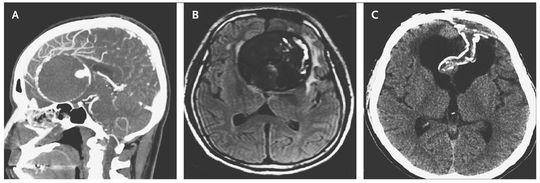 A 55-year-old man presented with a 3-year history of visual impairment associated with personality changes. His sister had died after an intracerebral aneurysmal rupture. An examination revealed poor visual acuity in the right eye with a field defect, as well as impaired neurocognition. Computed tomographic (CT) angiography (Panel A) and magnetic resonance imaging of the brain revealed a partially thrombosed, calcified, 7-cm aneurysm of the anterior communicating artery, with surrounding edema (Panel B). Thrombectomy and aneurysmal repair were performed to reduce the risk of aneurysmal rupture and to alleviate the mass effect. The patient recovered from surgery and had improvement in his neurocognitive deficits and vision, and he was able to return to work. His condition remained stable 2 years later, and delayed CT showed collapse of the aneurysmal sac (Panel C). Giant aneurysms (>2.5 cm) represent a small proportion of brain aneurysms but are associated with a high rupture rate when left untreated. Approximately 20% of patients with a brain aneurysm have a first-degree relative with a brain aneurysm.