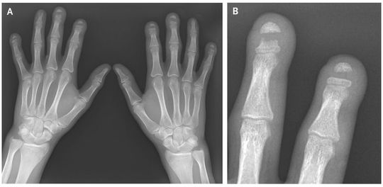 A 23-year-old male construction worker with a history of autoimmune sclerosing cholangitis presented with a 3-year history of coldness affecting both hands, triphasic Raynaud’s phenomenon, and tightening of the skin. Physical examination revealed mild clubbing of the fingers; patchy, nodular thickening of the skin on the hands and forearms; and linear plaques of fibrosis extending proximally past the elbows. His serum was positive for antinuclear antibody (titer, 1:1280) in a homogeneous pattern. Tests for anti–double-stranded DNA, anti-ribonucleoprotein, and anti-Scl-70 antibodies were negative. Plain radiographs of the hands showed sharply demarcated osteolysis of the midshaft of the distal phalanges of the index, middle, and little fingers on both hands and of the left ring finger (Panel A, with Panel B showing an enlarged image of the middle and index fingers of the left hand). This rare finding, known as band acro-osteolysis, has been associated with exposure to polyvinyl chloride (PVC) and with the Hadju–Cheney syndrome. The patient said he had had no exposure to PVC and had no personal or family history of congenital bone dysplasia. Because his symptoms were suggestive of atypical systemic sclerosis, immunosuppressive therapy with mycophenolate was initiated, and treatment with losartan was started for Raynaud’s phenomenon. At 1 year, his condition was clinically and radiologically stable and the Raynaud’s symptoms were reduced.