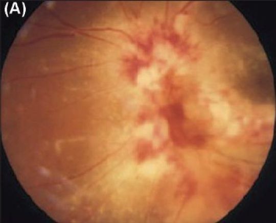 There are three clinical forms of CMV retinitis. The classical form (pizza pie retinopathy or cottage cheese with ketchup) is characterized by confluent retinal necrosis with hemorrhage that develops mostly in the posterior retina. The advancing edge of these lesions is usually very sharp and spreads contiguously. Typically, over several weeks untreated lesions progress to full-thickness necrosis with resultant retinal gliosis and pigment epithelial atrophy. Patients often have loss of visual field or visual acuity and scotoma. The second type is granular variety of CMV retinitis and the third is frosted branch angiitis variety of CMV retinitis. Treatment of CMV retinitis is individualized and depends upon the location of the active retinitis and the immune status of the patient. Currently available anti-CMV agents include ganciclovir and its prodrug valganciclovir, foscarnet, cidofovir, fomivirsen, ganciclovir implant and oral valganciclovir.