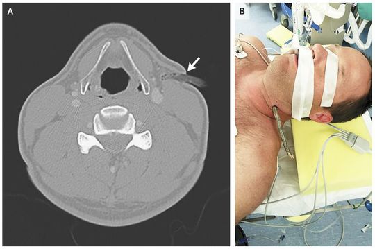 A previously well 40-year-old man was riding a mountain bike off-road when he fell and impaled his neck on a branch that was 2 cm in diameter. The patient did not attempt to remove the branch, and he transported himself to our emergency department. A computed tomographic angiogram showed the foreign body in the soft tissues of the left side of the neck at the level of the superior thyroid cartilage, extending through the platysma muscle, to the anterior margin of the sternocleidomastoid muscle (Panel A, arrow). The branch extended approximately 1.6 cm deep into the neck from the skin surface, with no evidence of vascular or airway injury (Panel A). Penetrating neck injuries can be associated with vascular, airway, cervical spine, or nerve injuries. The foreign body may be providing tamponade if a major vascular structure is injured; hence, there is a possible benefit to leaving the foreign body in place until radiologic and surgical evaluations are performed. In the operating room, the foreign body (Panel B) was removed, and the wound was explored, irrigated, and closed. The patient had an uneventful postoperative course.