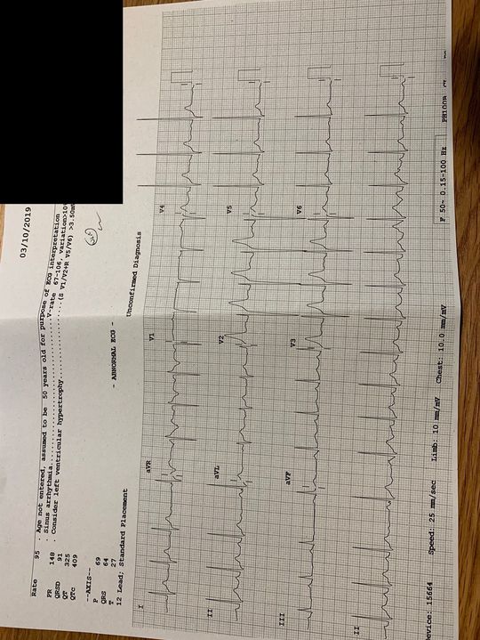 ECG/EKG of an 18yo male, presented with left sided chest pain, SOB, palpitations and rapid heart rate of 134 BPM BP 157/90 sp02 100% on air and resps 18