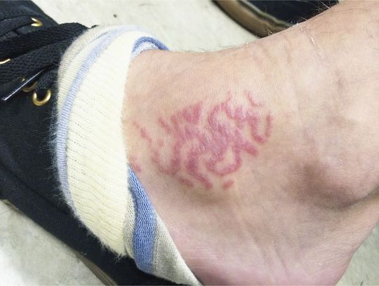 A 31-year-old man presented with a 1-week history of pruritic rash on his left foot, which developed after he brushed against coral while snorkeling in the Caribbean Sea. After contact with the coral, he reported the onset of a burning sensation in the foot, which was followed 1 hour later by the development of an intensely pruritic rash. The physical examination revealed an erythematous, cerebriform plaque on the lateral aspect of the left foot. On the basis of the patient’s history and cutaneous findings, a diagnosis of coral dermatitis was made. Coral dermatitis is a form of contact dermatitis that is caused by numerous species of coral that produce nematocysts, which are specialized organelles that discharge dermatologic toxins. Envenomation may result in both acute and delayed reactions. Acute reactions are thought to be forms of irritant contact dermatitis and typically present with urticarial or vesiculobullous plaques immediately or within hours after exposure. Delayed reactions are more likely to be forms of allergic contact dermatitis that are mediated by type I and type IV hypersensitivity reactions and are characterized by firm, localized papules that arise days to weeks after exposure. In rare cases, superficial epithelioid granulomas may be noted on biopsy. The patient was treated with triamcinolone ointment, and the lesion resolved after 2 weeks.