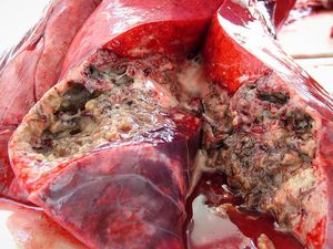 Here is the gross appearance of a lung with tuberculosis that underwent a caseous necrosis. Tuberculosis encompasses an enormously wide disease spectrum affecting multiple organs and body systems predominantly caused by the organism Mycobacterium tuberculosis. Pulmonary manifestations are most commonly seen by primary TB infection are a major source of spread of the disease and of individual morbidity and mortality. In primary pulmonary TB, the initial focus of infection can be located anywhere within the lung and has non-specific appearances ranging from too small to be detectable, to patchy areas of consolidation or even lobar consolidation. In most cases, the infection becomes localised and a caseating granuloma forms (tuberculoma) which usually eventually calcifies and is then known as a Ghon lesion. In nearly all cases, these granulomas resolve and there is no further spread of the infection. Secondary TB is seen mostly in adults as a reactivation of previous infection (reinfection), particularly when health status declines. The granulomatous inflammation is much more florid and extensively widespread. This pattern of multiple caseating granulomas primarily in the upper lobes is most characteristic of secondary (reactivation) tuberculosis. When there is extensive caseation and the granulomas involve a larger bronchus, it is possible for much of the soft, necrotic center to drain out and leave behind a cavity. Cavitation is typical for large granulomas with tuberculosis and is more common in the upper lobes.