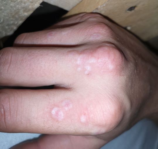 Small bumps on knuckles. Tested for allergies, no allergies. Bumps aren't painful, itching nor irritated. Bumps are hard in structure. White in color. Bumps are on both hands, and only located on the knuckles. One hand counts about 21 bumps. No further history of dermatology problems, no eczema. Person does work with flower and plants, maybe this is related? Does anybody have a diagnosis for this? Thanks in advance!