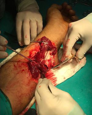 On examination, the flexor tendons were ruptured, ulnar nerve damaged, and his hand was pale and cold to the touch due to extensive blood loss. Forearm tendon repair is carried out when one or more tendons are ruptured or are cut, leading to loss of normal hand movements. During a reconstructive operation, the two ends of the ruptured tendons should be carefully identified and sutured back. After a successful surgery, tendons and nerves were repaired and the skin was closed. Photo by @sonerlap