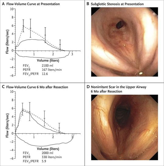 A 55-year-old woman presented with a 6-month history of exercise-induced dyspnea and intermittent wheezing. Clinical examination revealed inspiratory stridor. Spirometry revealed a flattened inspiratory and expiratory flow-volume loop (Panel A; the dotted line indicates the reference curve, and the vertical lines means with 95% confidence intervals) and an Empey index (the forced expiratory volume in 1 second [FEV1] in milliliters divided by the peak expiratory flow rate [PEFR] in liters per minute) of 12.6, suggesting upper-airway obstruction. Bronchoscopy revealed subglottic stenosis (Panel B). Computed tomography revealed a concentric stenotic tracheal segment without external compression. Cricotracheal resection with end-to-end anastomosis was performed. Histopathological analysis revealed chronic fibrosing inflammation without evidence of cancer, vasculitis, or granulomas. A diagnosis of idiopathic subglottic stenosis was made. A rare inflammatory process of unknown origin, idiopathic subglottic stenosis typically occurs in women and is limited to the subglottic region and the first two tracheal rings. Therapy options include endoscopic procedures, glucocorticoid injections, and resection. Flattened inspiratory and expiratory flow-volume loops on spirometry and an Empey index of more than 10.0 support a diagnosis of fixed upper-airway stenosis. Lung-function testing in this patient 6 months after surgical resection showed near-normalization of the flow-volume Bronchoscopy revealed a nonirritant scar (Panel D).