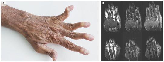 A 58-year-old man presented with a 15-year history of systemic lupus erythematosus (SLE) that was characterized by polyarthritis, photosensitivity, malar rash, and pleuritis. Laboratory workup revealed antinuclear antibodies, anti–double-stranded DNA antibodies, anti-Ro (SS-A) antibodies, non–nephrotic-range proteinuria, and leukopenia. Testing for rheumatoid factor and anti-CCP antibodies was negative. Despite treatment with glucocorticoids, hydroxychloroquine, and azathioprine, hand deformities, including swan neck deformity, Z deformity of the thumb, and ulnar deviation of the fifth digit, developed over a 10-year period (Panel A and video). These deformities were reducible and are characteristic of Jaccoud’s arthropathy. Magnetic resonance imaging of the hands showed no erosions (Panel B). Although classically described in rheumatic fever, Jaccoud’s arthropathy has also been described in SLE and other diffuse connective-tissue diseases. In Jaccoud’s arthropathy, the deformities result mainly from soft-tissue abnormalities, such as laxity of ligaments, fibrosis of the capsule, and muscular imbalance, rather than from destruction of the bone of joints, as occurs in rheumatoid arthritis. The mainstay of the management of Jaccoud’s arthropathy includes physical therapy and the use of orthotic devices. Because this patient is a taxi driver, the hand deformities have been an important limitation to his capacity for work, despite physical therapy for muscle strengthening. Soft-tissue surgery for the correction of the hand deformities is under consideration but has not been performed.