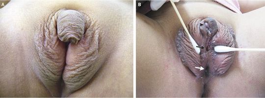 A full-term infant was born with ambiguous genitalia (Panel A). There was no family history of similar presentations or known genetic disorders. The neonate was noted to have sinus tachycardia with a heart rate of up to 179 beats per minute without hypotension. Laboratory evaluation revealed an elevated potassium level of 7.4 mmol per liter (normal range for all persons, 3.5 to 5.3), a low sodium level of 125 mmol per liter (normal range, 135 to 148), an elevated 17-hydroxyprogesterone level of 196.0 μg per liter (593.0 nmol per liter; normal range, 0.5 to 2.4 μg per liter [1.5 to 7.0 nmol per liter]), and a testosterone level of more than 15.0 ng per milliliter (52.0 nmol per liter; normal range, 0.1 to 0.8 ng per milliliter [0.3 to 2.8 nmol per liter]). Ultrasonography of the abdomen revealed bilateral adrenal hypertrophy without visible testes, and chromosomal analysis revealed the 46 XX karyotype. Salt-losing congenital adrenal hyperplasia due to 21-hydroxylase deficiency in a female infant was diagnosed. The ambiguous genitalia, which is characterized by hypertrophy of the clitoris and labia majora and the presence of a urogenital sinus, may resemble hypospadias with cryptorchidism in males. Medical management of electrolyte abnormalities, intravenous fluids, and glucocorticoid and mineralocorticoid replacement were initiated. At 2 years of age, the patient underwent complex surgical reconstruction, including repair of the urogenital sinus (Panel B, black arrow), clitoroplasty (arrowhead), and vaginoplasty (white arrow). The patient has regular follow-up and is doing well with glucocorticoid and mineralocorticoid replacement therapy.