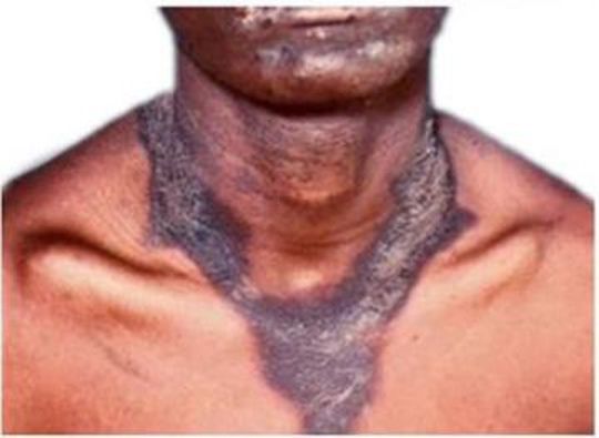 Brilliant Macular Degeneration the picture does shows the Casal collar or Casal necklace . Casal collar or Casal necklace is a clinical sign in which there is an erythematous pigmented skin rash in the distribution of a broad collar (dermatomes C3 and C4). It is seen in patients with pellagra.