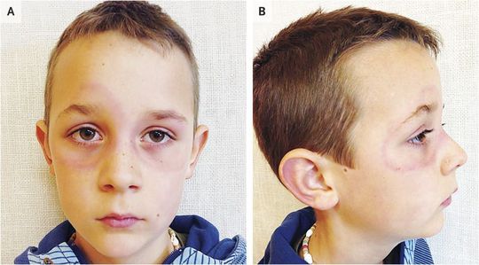 An 8-year-old boy presented with a 10-day history of periorbital rash, which had been preceded by knee pain, fever, and headache. During a walk in a forest 3 weeks before presentation, he was bitten on the back of his right knee by two ticks, which were removed 2 days later. On examination at presentation, he was noted to have erythema migrans periorbitally (Panels A and B), on the front of the right knee, on the right axilla, and on his buttocks. Serologic testing was notable for a Borrelia burgdorferi IgG antibody level of 0.58 (normal Lyme-index value, <0.20), a B. burgdorferi sensu lato IgG anti-VlsE level of 75.5 kU per liter (normal level, <16.0), and a B. burgdorferi IgM antibody level of 5.85 (normal Lyme-index value, <0.20). Immunoblot testing for B. garinii IgG and IgM antibodies was positive. Erythema migrans is a common manifestation of early, disseminated Lyme disease. However, it may be varied in its presentation, as seen in this patient. The patient received treatment with amoxicillin for 3 weeks and had a complete recovery.