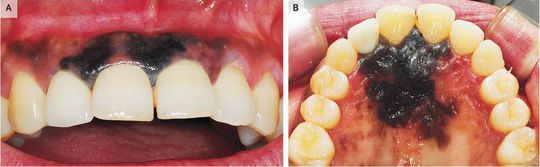 A 60-year-old woman presented with a 2-month history of black discoloration on her upper gums after blunt trauma to the mouth. She had previously been well and was a lifelong nonsmoker and nondrinker. On examination, diffuse black pigmentation was seen on both the labial and palatal sides of the anterior maxilla (Panels A and B, respectively), without tooth mobility or palpable lymphadenopathy. No bone destruction was detected on a standard dental radiograph. A hypermetabolic signal was seen in the anterior maxillary area on positron-emission tomography–computed tomography, with no metastatic spread to the lymph nodes. Incisional biopsy and histologic analysis revealed malignant melanoma. Primary malignant melanoma is uncommon in the oral cavity. Unfortunately, diagnosis may be delayed because oral malignant melanomas are frequently asymptomatic and painless in their early stages. The lesion was resected, and the patient received chemotherapy. At the last follow-up, 26 months after the initial diagnosis, she had recurrent disease and distant metastases.