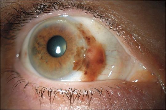 A 78-year-old woman with a medical history of glaucoma, diabetes, and cataracts presented for a routine ophthalmologic visit, during which she was found to have an erythematous and brown maculopapular lesion in her right eye. She reported that the lesion had been present for approximately 1 year, during which time it had fluctuated in size and bled occasionally, but that it had not been associated with pain, pruritus, or visual changes. An excisional scleral keratectomy was performed, followed by cryotherapy and alcohol application. Histopathological analysis revealed malignant conjunctival melanoma associated with primary acquired melanosis with atypia, measuring 1.0 mm thick and 4.0 mm in diameter. Conjunctival melanoma can arise from primary acquired melanosis. It is often associated with regional metastases, and local recurrence after treatment is common. Adjuvant treatment in this patient included chemotherapy and topical mitomycin. Nodal examination, bone scan, and computed tomography of the head, neck, chest, and abdomen revealed no metastatic disease. Eighteen months after treatment, there was no evidence of recurrence.